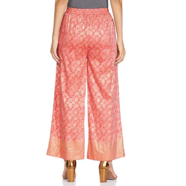 Pink coloured straight palazzos with ornamental foil print detail and elasticated waistband.