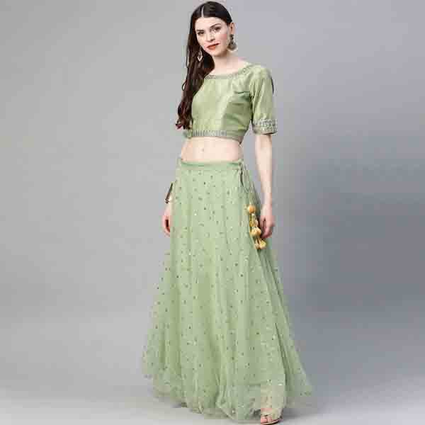 An amazing range of womens ethnic wear in soft and solid colors that looks perfect for festive wear. with beautiful designs and patterns. these apparels are very stylish and comfortable too. get rid of the traditional look this season wearing lehenga choli by readiprint fashions. this lehenga choli from readiprint fashions exhibits net fabric green colour semi-stitched lehenga with sequence work & choli with net dupatta.