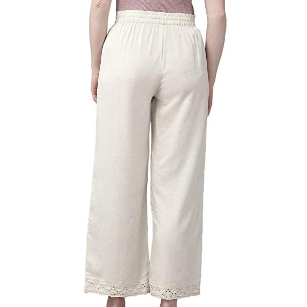 •  Offwhite Rayon Flex Solid Wide Leg Palazzo with Lacework in Hem & Side Pocket
