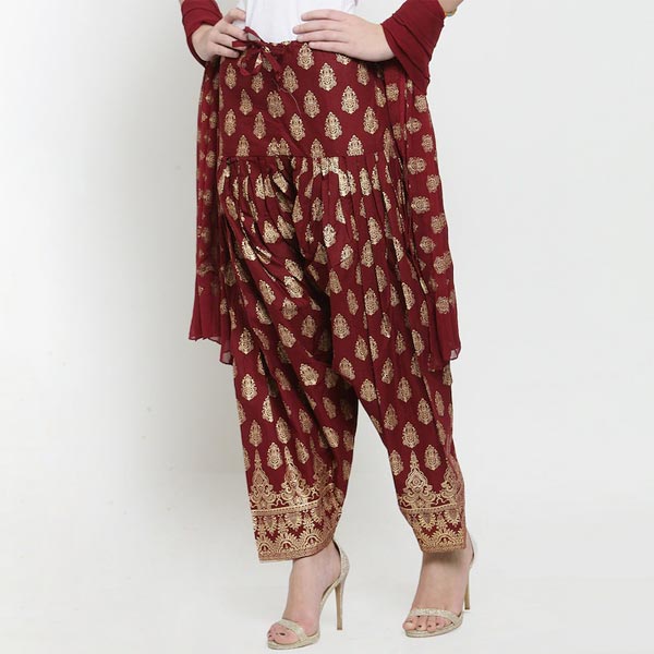 Maroon and gold-coloured printed salwar with gathers and pleats, has a waistband with drawstring closure