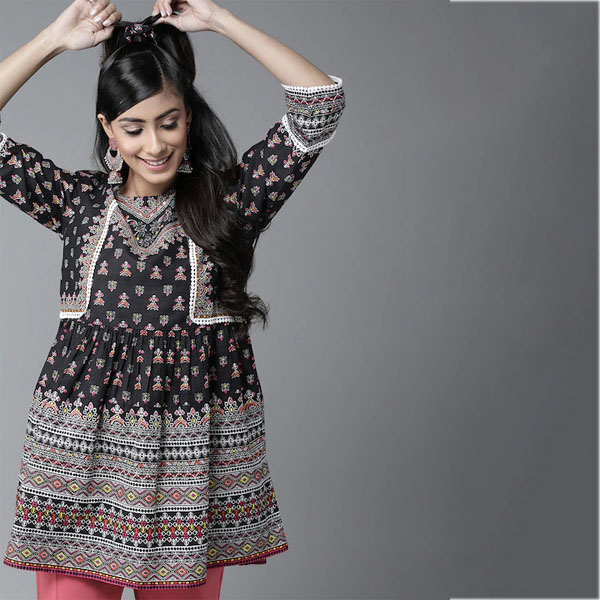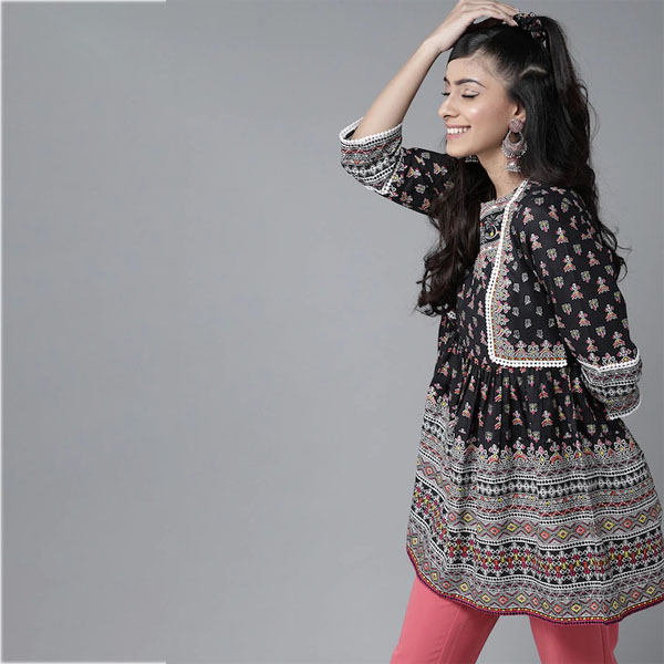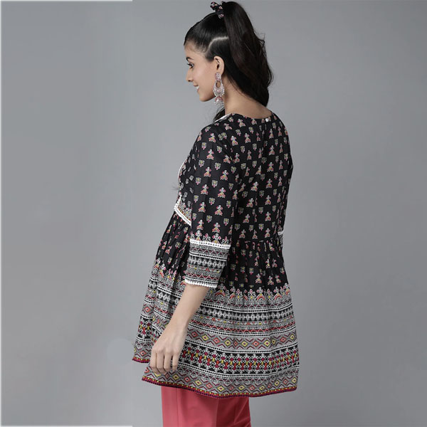 Black, white and pink printed tunic, has a round neck, three-quarter sleeves, lace Inserts detail, and button closure